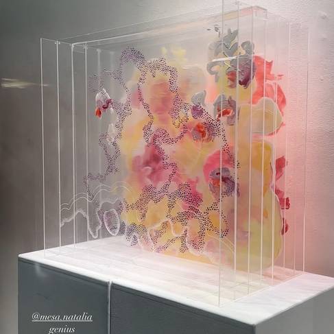 So, with all of this (and a bit more) in mind, I set out to paint some "layers of perception". I engraved mechanical and electrical signaling layers as an ode to Reni's research in prosthetics, painted a layer of chemical signaling, a layer of pain, a layer of "support systems" that look like flowers and a layer of healing. I kept making layers, building a visual language and figuring out how acrylic paint interacted with perspex. I made more layers of healing, phantom limb pain, the body schema, and support systems.